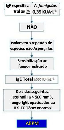 Outros fungos filamentosos, como Penicillium, Curvularia spp. e Schizophyllum commune, podem causar patologia semelhante à ABPA chamada de Allergic Bronchopulmonary Mycosis (ABPM),13,14 quando atribuível a fungos que não sejam Aspergillus spp. A estrutura básica para o diagnóstico de ABPM é semelhante à ABPA, com algumas distinções. (Tabela 3). A ABPM deve ser considerada em pacientes com possível ABPA, mas a IgE específica para A. fumigatus é menor que 0,35 kUA·l -1. A ABPM pode ser sugerida quando um fungo causador é isolado em pelo menos duas amostras de cultura de escarro ou cultura de material de lavado broncoalveolar. A ABPM é confirmada pela demonstração de sensibilização alérgica (teste cutâneo ou IgE específica para fungos), combinada com IgE total sérica elevada e características radiológicas consistentes.46 Infelizmente, ensaios comerciais para detecção de IgE e IgG contra fungos diferentes de Aspergillus spp. estão disponíveis apenas para algumas espécies (Alternaria, Cladosporium, Candida, Mucor, Trichophyton e Penicillium).