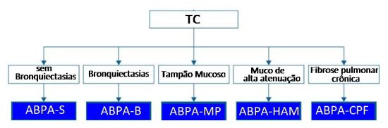 Diretrizes revisadas de prática clínica do grupo de trabalho ISHAM-ABPA de 2024 categorizam a ABPA en cinco categorias radiológicas: ABPA sorológica (ABPA-S), ABPA com bronquiectasias (ABPA-B), ABPA com tampão mucoso (ABPA -MP), ABPA com muco de alta atenuação (ABPA-HAM) e ABPA com fibrose pleuropulmonar crônica (ABPA-CPF).32 (Tabela 2)