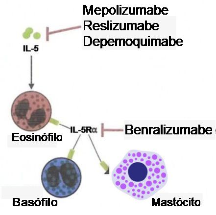 Além do tratamento anti-IgE que melhorou os desfechos em asma alérgica por duas décadas, quatro biológicos anti-IL-5 (mepolizumabe, reslizumabe e depemoquimabe) e o benralizumabe, tendo como alvo o receptor IL-5R-α (Figura1), o dupilumabe