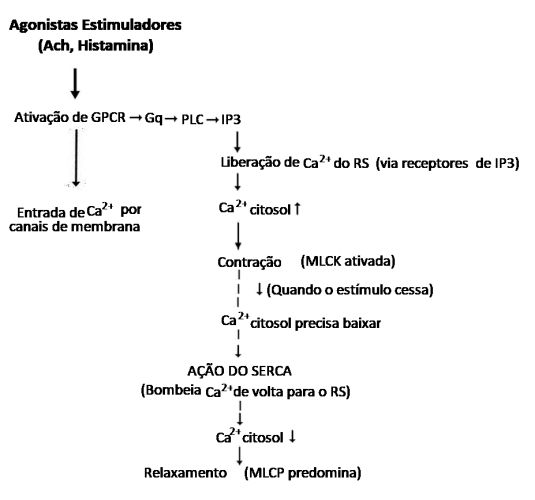 O aumento do Ca2+ intracelular é o evento central que desencadeia a cascata de contração através da via Ca2+/calmodulina ⇒ MLCK ⇒ fosforilação da MLC |