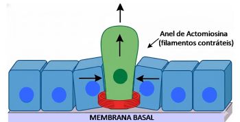 Os tecidos epiteliais devem manter sua integridade para desempenhar efetivamente suas funções de barreira. Um aspecto vital dessa regulação envolve a renovação e a eliminação de células através do processo de apoptose, um processo fisiológico essencial para eliminação de células defeituosas. As células mortas são então expelidas para assegurar a integridade da barreira epitelial funcional e a adesão contínua das células.4 Esse processo de extrusão é mediado pelas células destinadas à morte, que sinalizam às células epiteliais adjacentes para contrair. Forma-se então um anel de actomiosina de células contíguas cuja contração é essencial para a extrusão das células em processo de apoptose.4-6 O anel de actomiosina é formado em tecidos epiteliais por células vizinhas que "identificam" o apinhamento ou sinal de morte celular e se coordenam para formar essa estrutura contrátil. Vale ressaltar que isso acontece de um modo bem organizado e hierárquico, nada espontâneo. O posicionamento do anel de actomiosina não é arbitrário: ele ocorre em domínio específico para que a contração gere mudança de forma celular eficiente e direcional.7