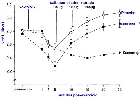 Existe também evidência de que o tratamento regular com b2-agonistas aumente a gravidade subjacente da AEI.11,12 Em um estudo, a queda do VEF1 determinada pelo exercício foi quase duas vezes maior após uma semana de uso regular de salbutamol do que após o uso de placebo (Figura 1).